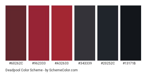 Deadpool Color Theme - Deadpool quickly became one of the most beloved superheroes, not only for his colors but also for his style and sincerity. Deadpool color palette created by yecats_elocin that consists #292929,#8b2323,#171717,#8b1a1a,#1c1c1c. The deadpool color scheme has 6 colors, which are caput mortuum (#60262c), japanese carmine (#962333), japanese carmine (#a32633), jet. Inspired by the bold and vibrant hues of the iconic character,.