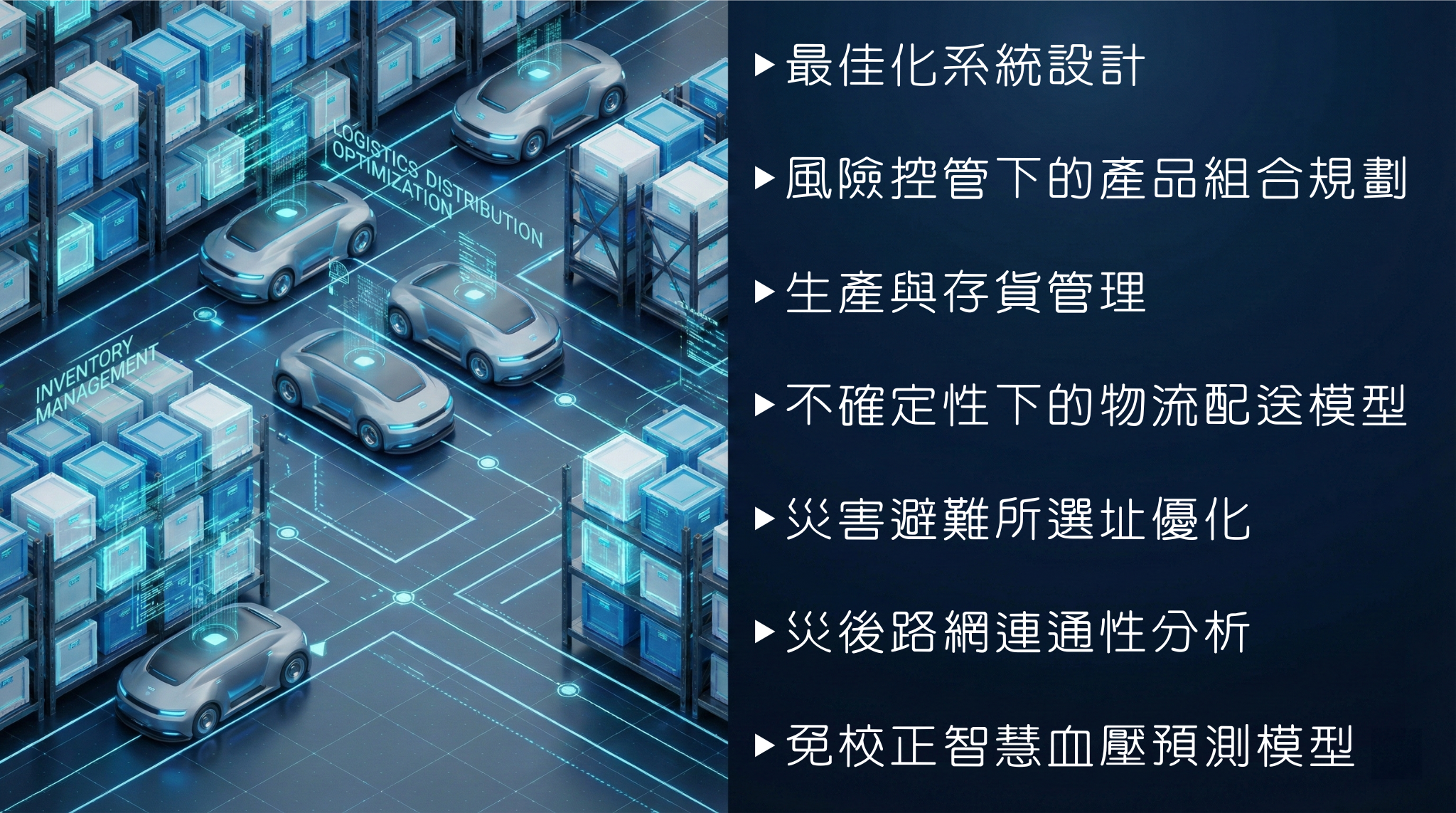 本實驗室專注在大數據分析與優化演算法之開發以及相關產業應用,包含製造參數最佳化、良率改善、機台故障預測、預測性保養、生產與存貨管理以及最佳化系統設計等,下列為相關產業應用範疇: