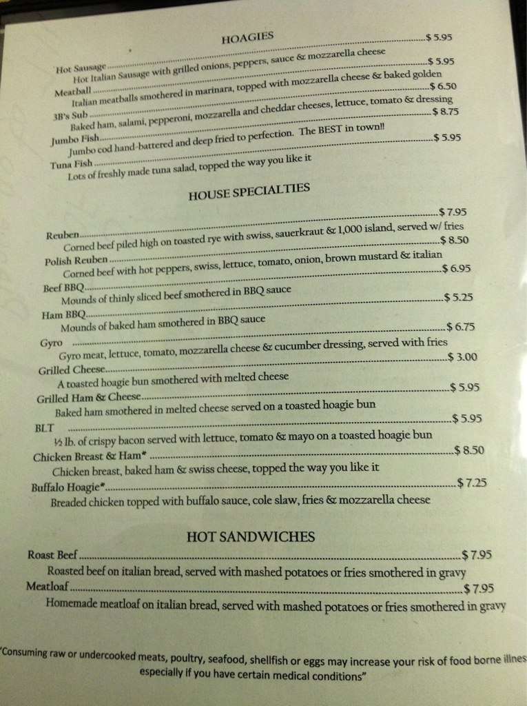 Menu at Three B's pub & bar, Zelienople