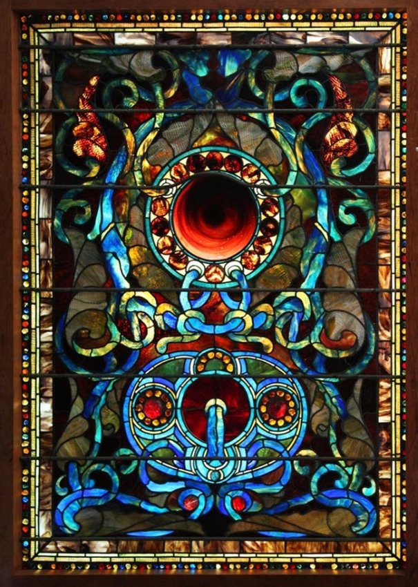 7556 Antique LaFarge Stained Glass of Jewels & Circles Lot 1003