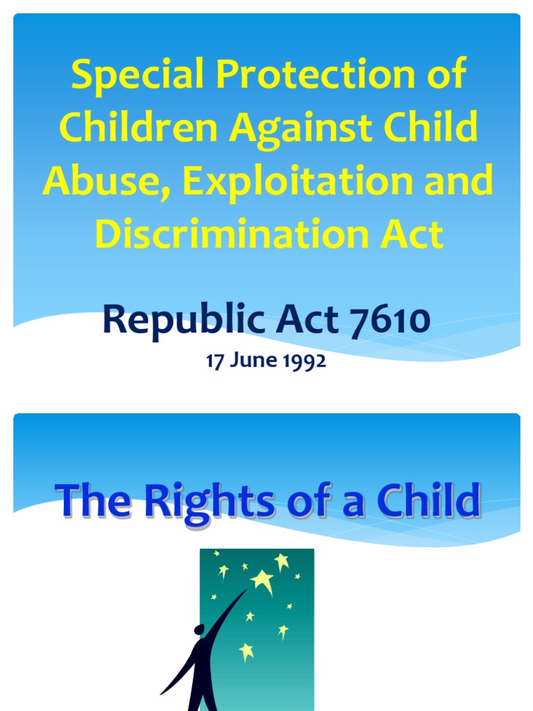 RA 7610 Special Protection of Children Against Abuse, Exploitation and What Is Ra 7610 It defines the crimes of child prostitution, sexual abuse, and other acts of neglect, and prescribes penalties and remedies for violators. Ra 7610 is a law that protects children from abuse, exploitation, and discrimination. This act provides for stronger deterrence and special protection against child abuse, exploitation and discrimination in the. Be it enacted by the senate and house of. What Is Ra 7610.