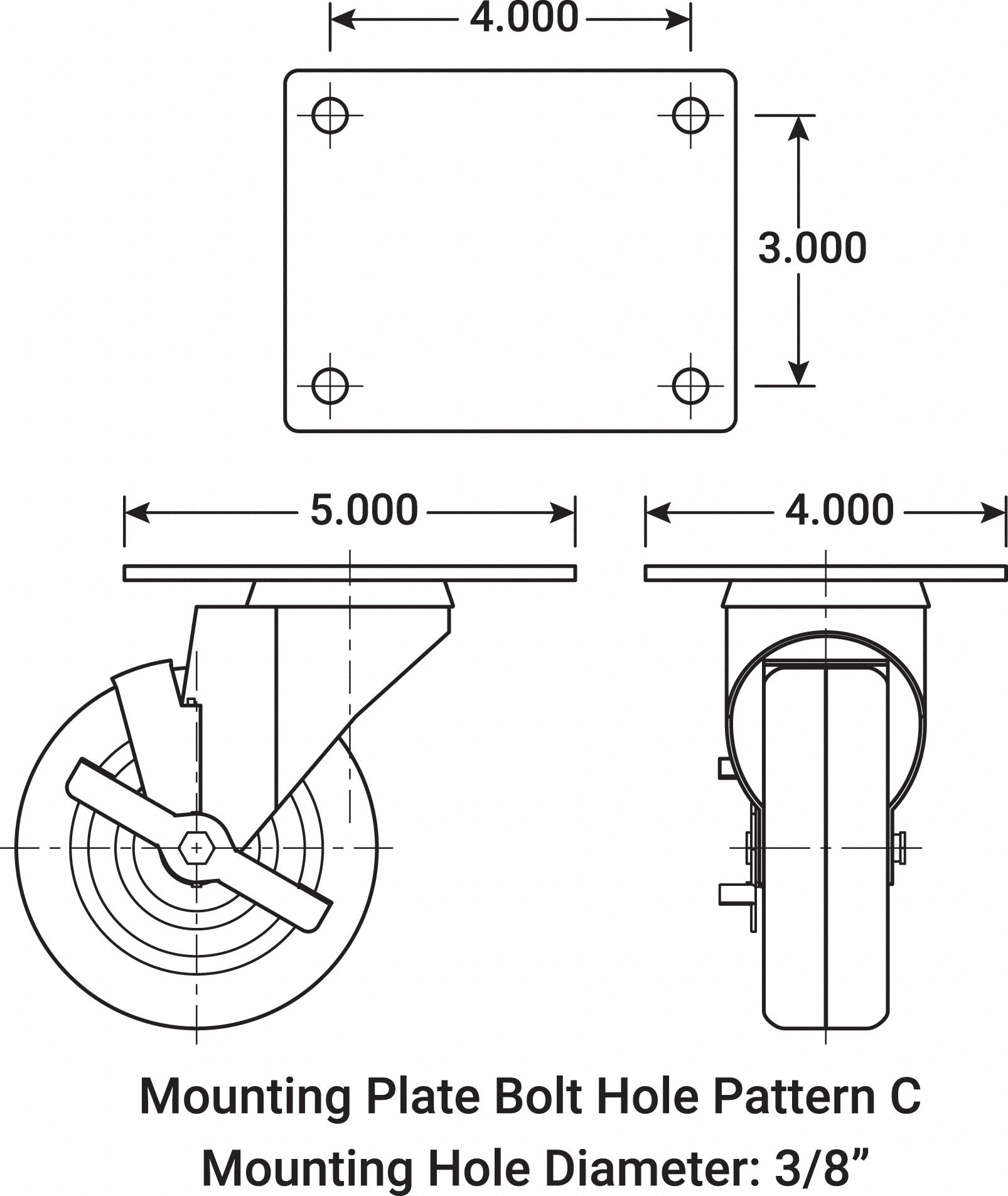 GRAINGER APPROVED Standard Plate Caster 4 in Wheel Dia., 200 lb, 5 1/8