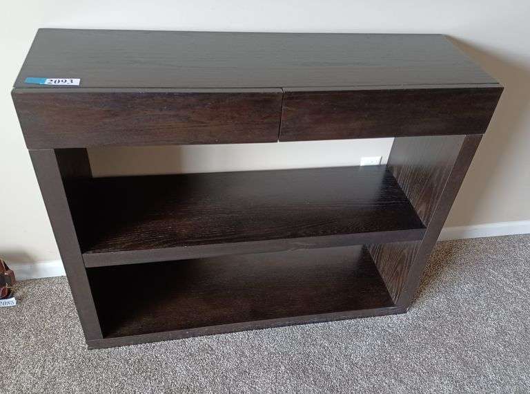 Two drawer dark wood shelves with open back Mark Van Hook, Auctioneer