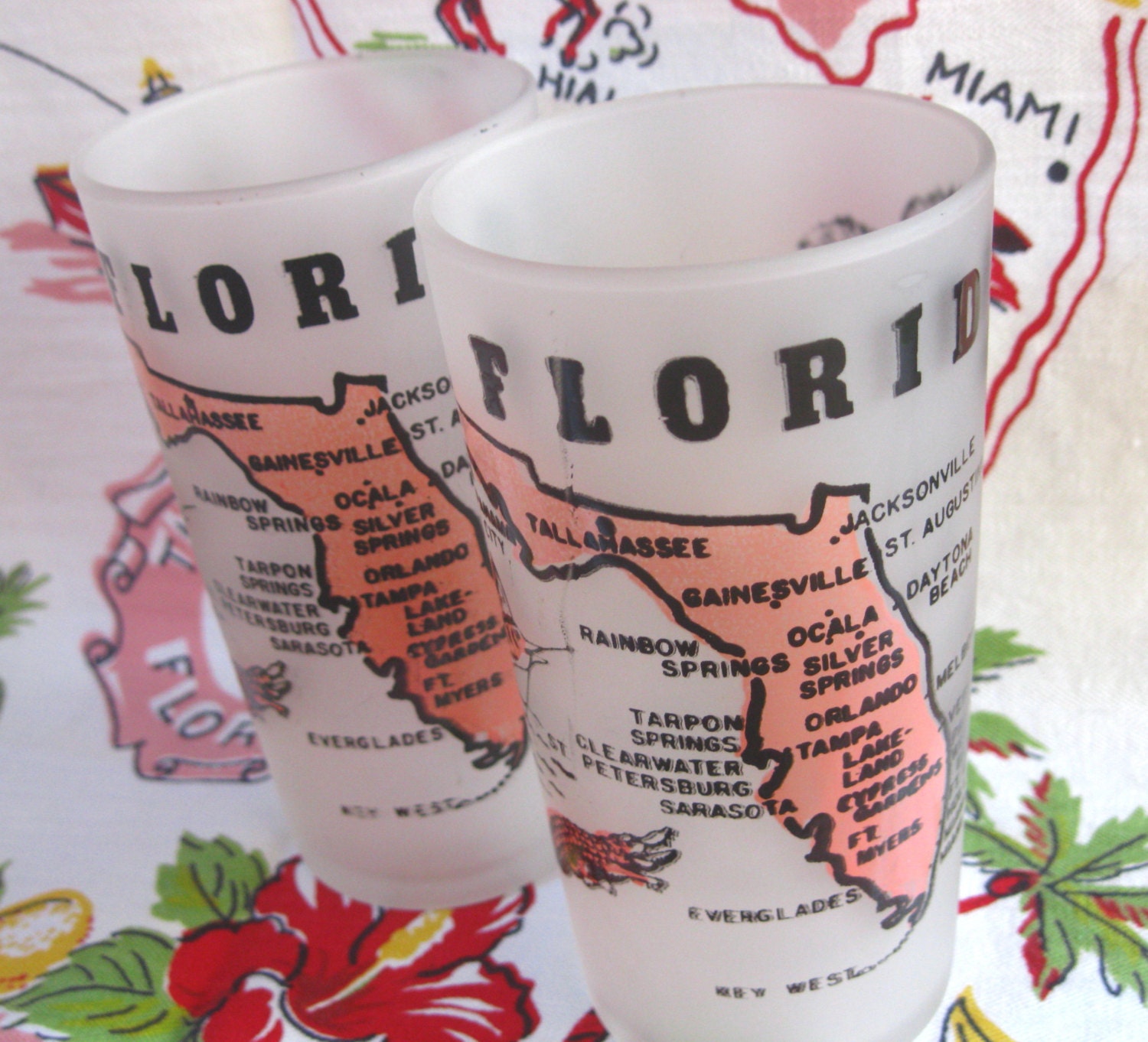 Set of 2 vintage Florida souvenir glasses frosted with pink
