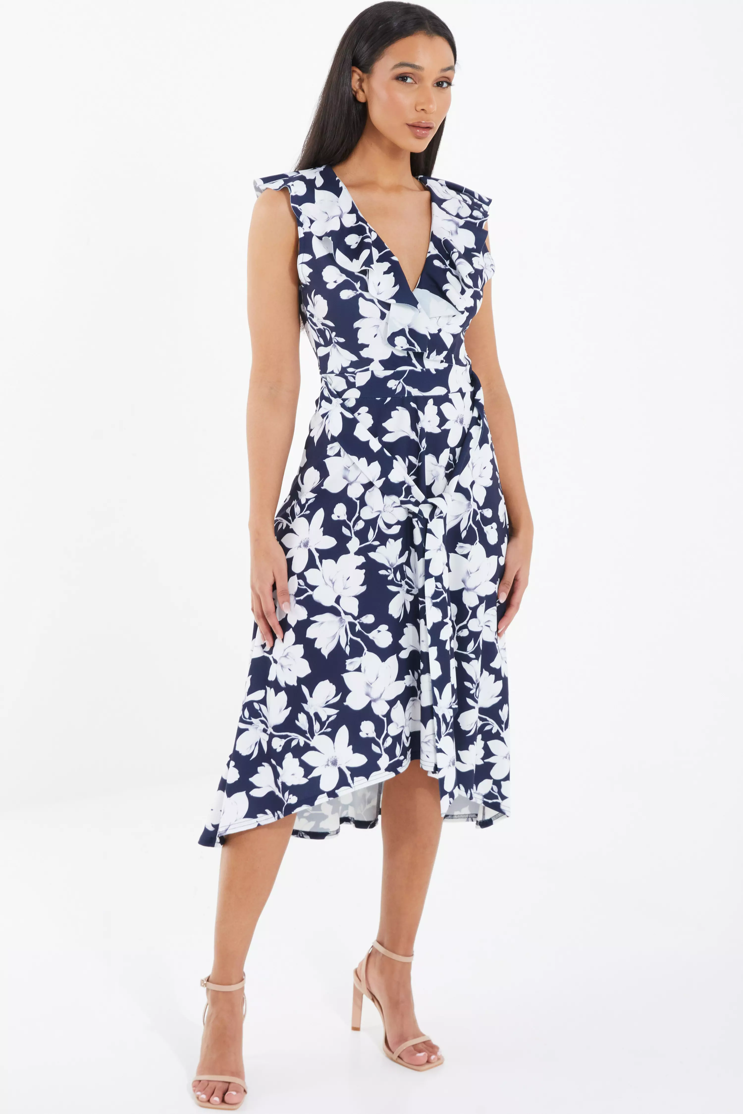 Navy Floral Dip Hem Midi Dress QUIZ Clothing Floral Dip Hem Midi Dress 5‘ 9 model wears uk 8 / us 4 / eur 36. 1m+ visitors in the past month Available with quick delivery and easy return. The floral printed fabric falls into an flowing dip hem skirt. Always check the wash care label, cool hand. A classic option thanks to the wrap over neckline and short sleeves, this style guarantees. International. Floral Dip Hem Midi Dress.