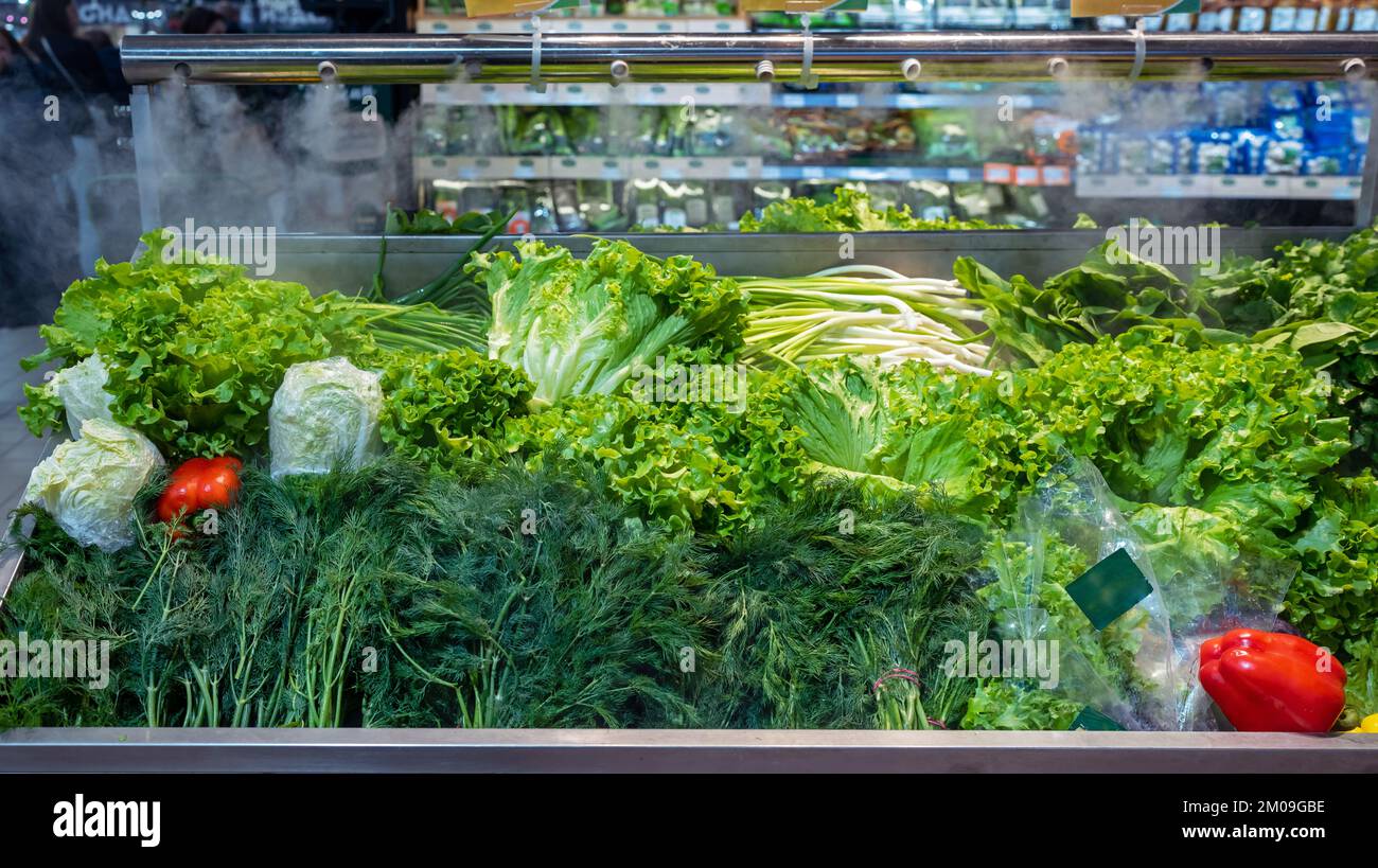 Sale of fresh green vegetables lettuce salad, parsley, dill, green onions, herbs. Fresh herbs