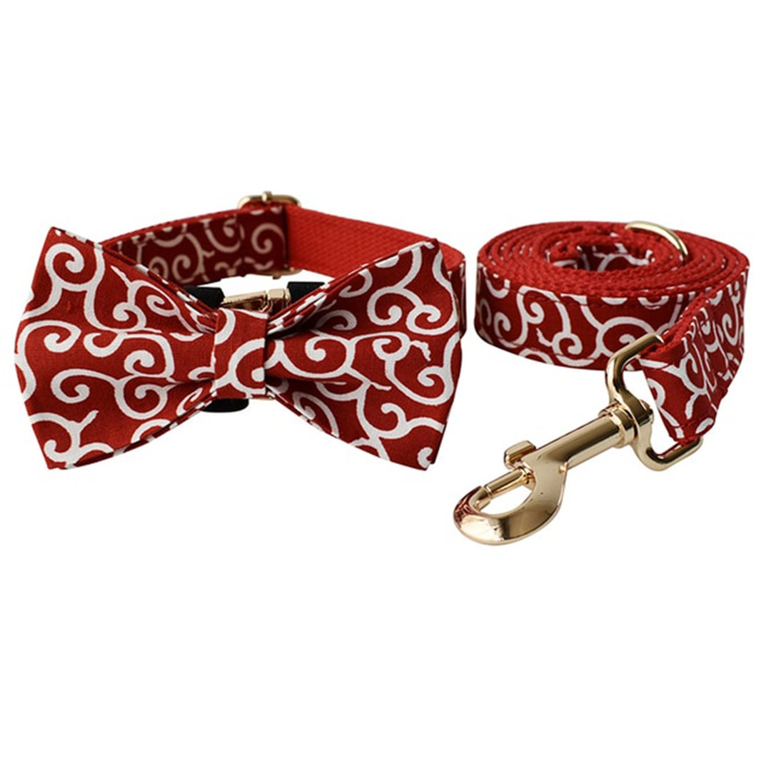 Red Scroll Swirls Dog Bow Tie With Collar, Engraved Dog Collar With Bow Tie, Swirls Dog Collar