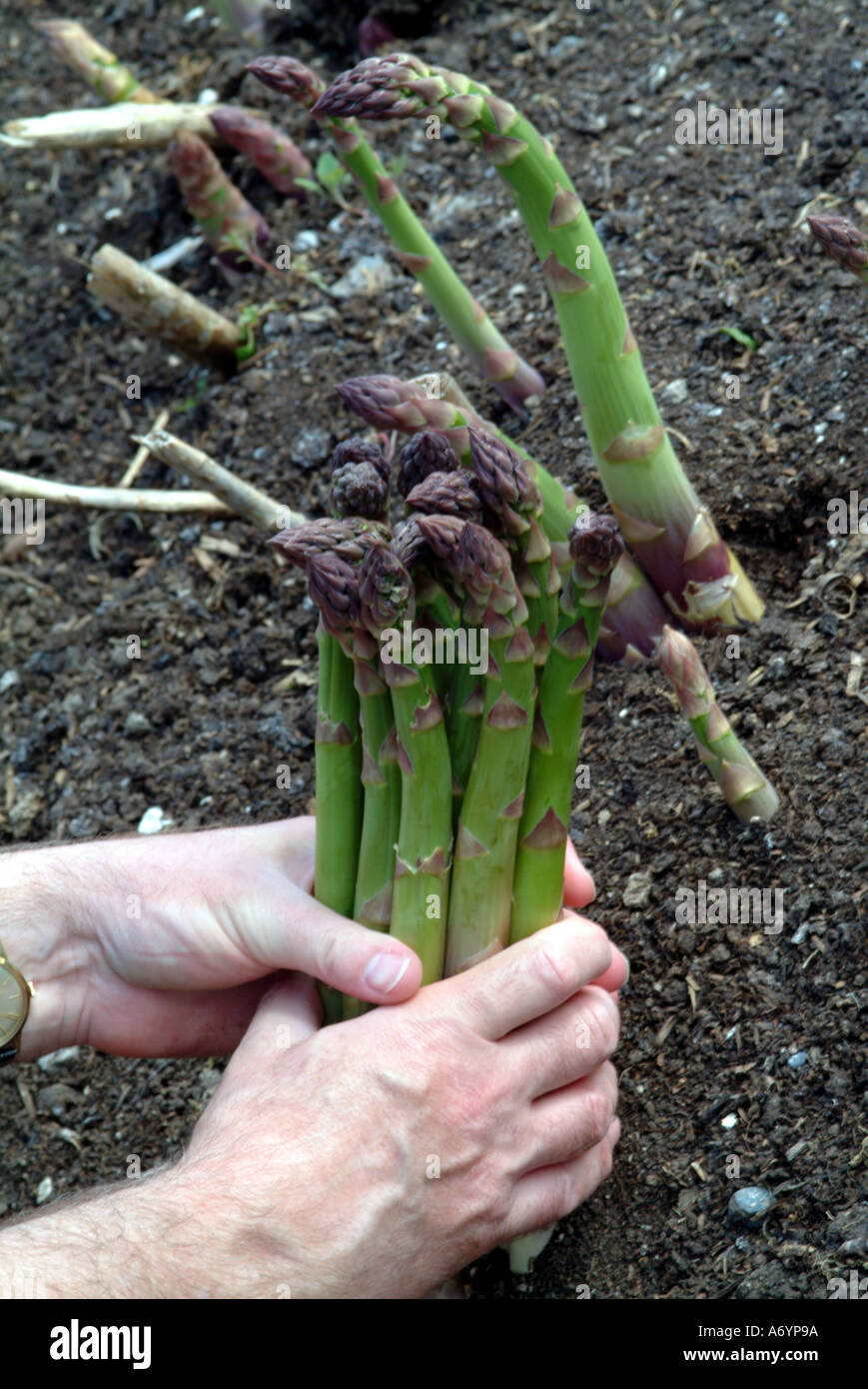 PLANTING ASPARAGUS CROWNS PLACE CROWN ON TOP OF SOIL RIDGE Stock Photo
