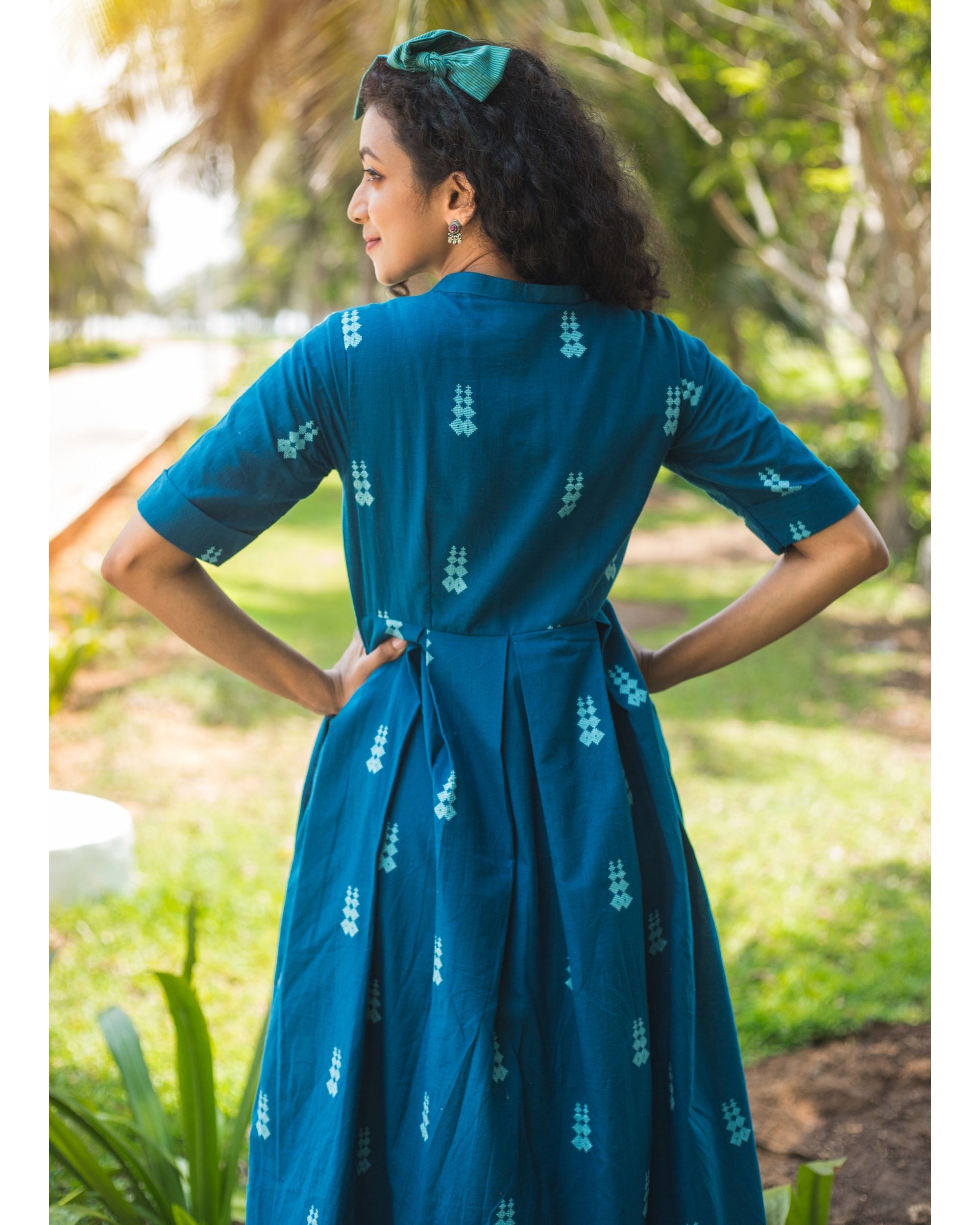 Blue cotton jacquard pleated dress by Niram The Secret Label