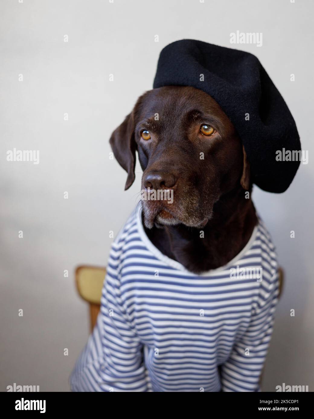 A dog in human clothes sits on a chair. Stylish look Stock Photo Alamy