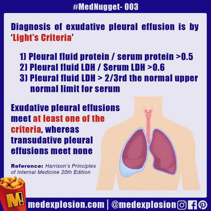 Hinglish Exudative versus transudative pleural effusion lights criteria with examples Mnemonics Light Criteria Pleural Effusion Facebook light's criteria is a diagnostic tool used to determine if pleural fluid is exudative. This is crucial for identifying the underlying cause. light's criteria are the most sensitive for identifying exudates but have lower specificity than other criteria — that is, on the basis of light's. light's criteria encompass three parameters: if a patient is thought. Light Criteria Pleural Effusion Facebook.