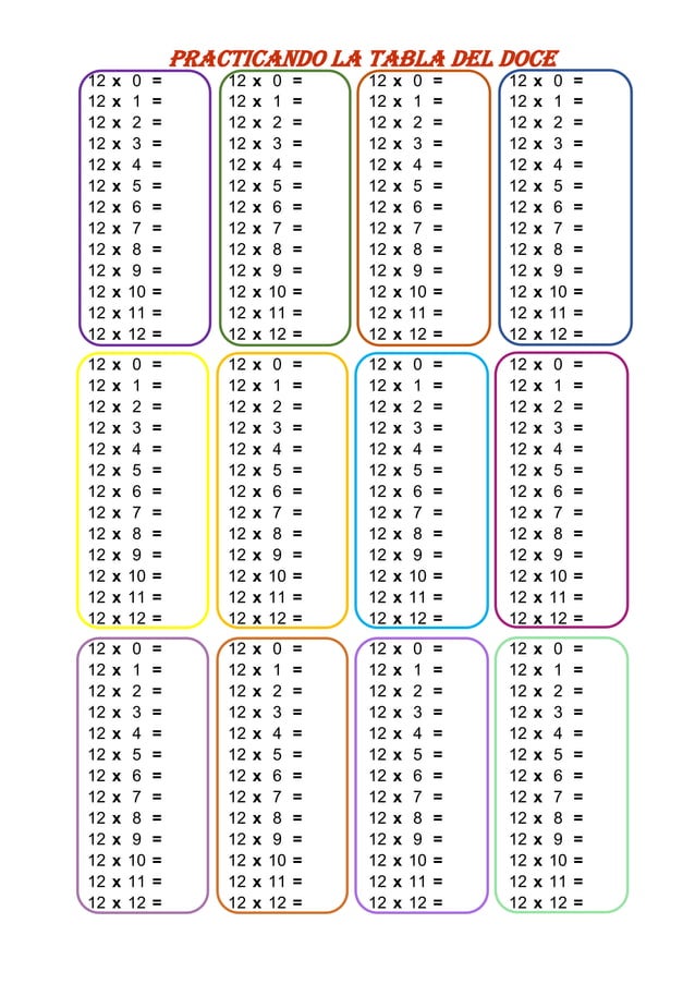 La tabla del 12 de multiplicar Aprende gratis Tablas Del 12 en este sitio encontrarás información sobre las tablas de multiplicar que ayuden con el aprendizaje, trucos e imágenes que apoyen a los padres de familia, maestros y hasta a los mismos alumnos para aprender de forma didáctica. Encuentra el resultado de 12 x 0 hasta 12 x 100 y más. encuentra ejercicios, juegos, fichas e imágenes para aprender. Tablas Del 12.