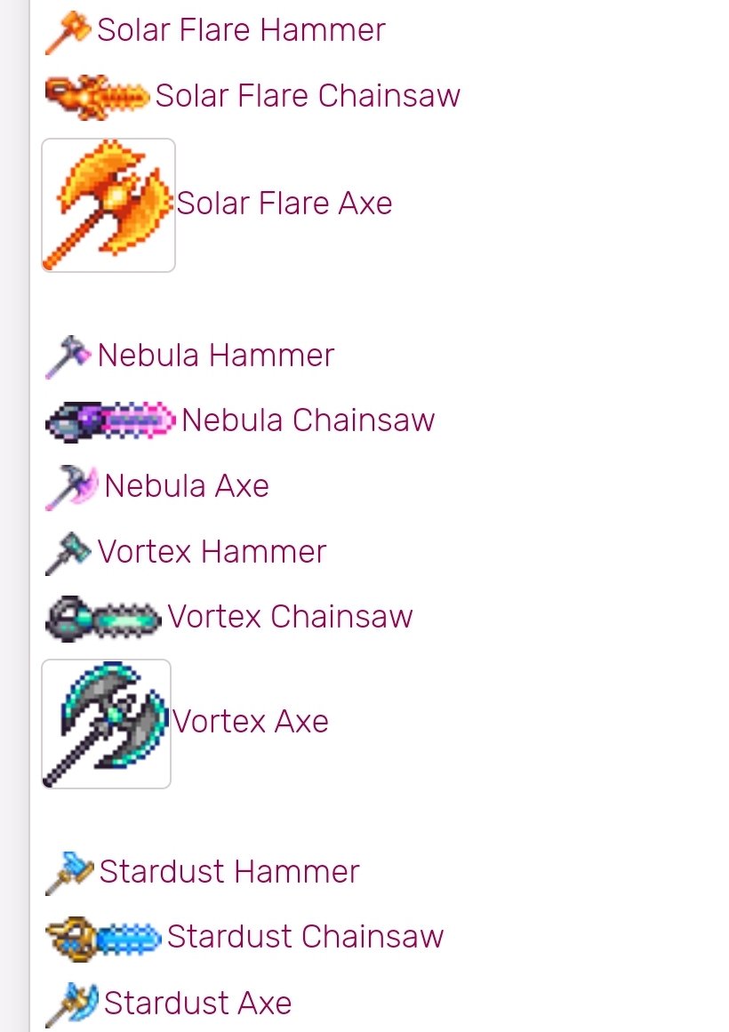 Nebula great axe Terraria All Axes In Terraria 25 rows learn about the different axes and hamaxes in terraria, the only tools that can chop wood and glowing mushroom. Axes are basic tools that a player can use to destroy trees and cacti, including their variants. Pages in category axes the following 27 pages are in this category, out of 27 total. Compare the axe power, swing speed,.. All Axes In Terraria.
