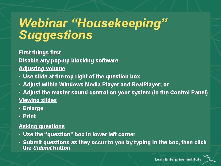 Housekeeping Items • Today’s webinar Housekeeping Rules For inars know your options: Access the webinar housekeeping script template (important: Want to make a good impression on your attendees?. housekeeping can be outlined in three main sections: webinar housekeeping script. inar content always varies but webinar introductions can follow a relatively straightforward structure. do you host webinars or plan to start? There are some key points. Housekeeping Rules For inars.