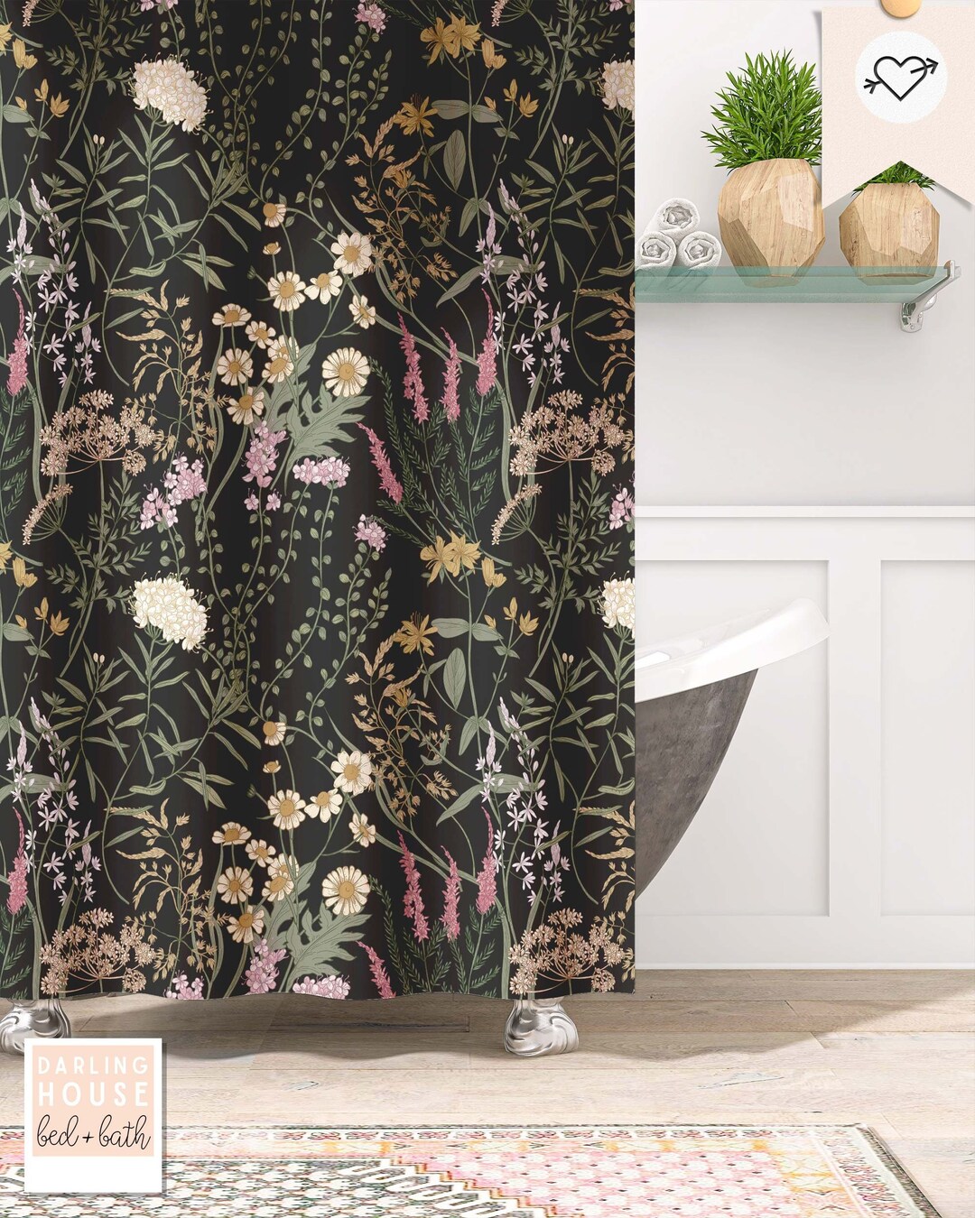 Moody Wildflower Meadow Black Shower Curtain Dark Academia Cottagecore