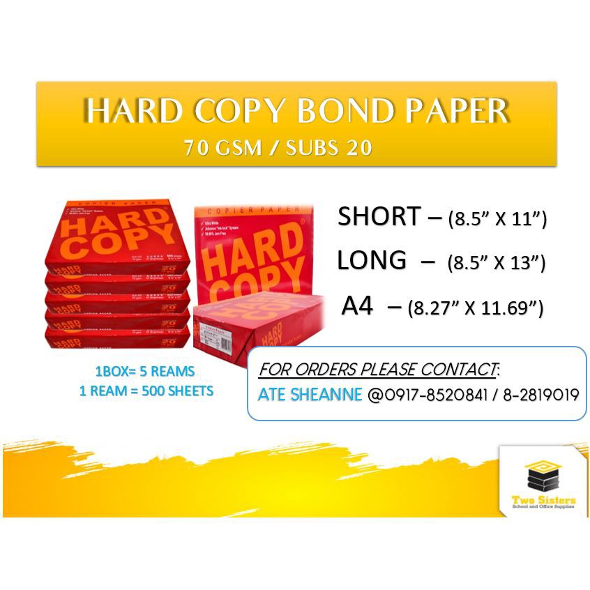 HARD COPY BOND PAPER Substance 20 (Short, A4 and Long 500 Sheets/Ream