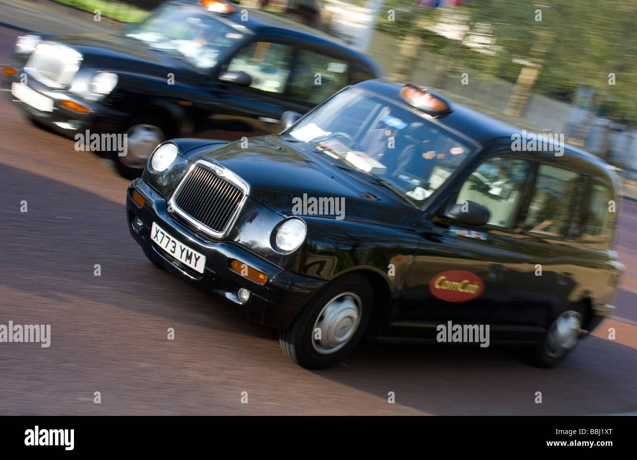 Two London black cabs drives along the road Stock Photo Alamy