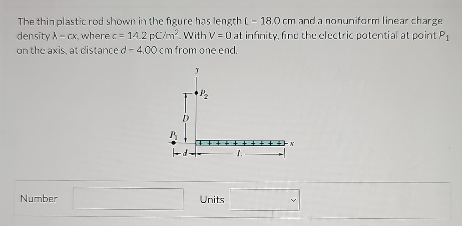 Solved (6) Problem 12 A Plastic Rod Of Length D=1.5 M L... A Plastic Rod Of Length 2.2 M (a) with v = 0 at. A thin plastic rod of length 2.9 m is rubbed all over with wool, and acquires a charge of 64nc, distributes uniformly over this surface. A plastic rod of length 2.2m and radius 3.6 mm carries a negative charge of 3.8 × 10−7c spread uniformly over its surface. The rod carries a uniform charge. A Plastic Rod Of Length 2.2 M.
