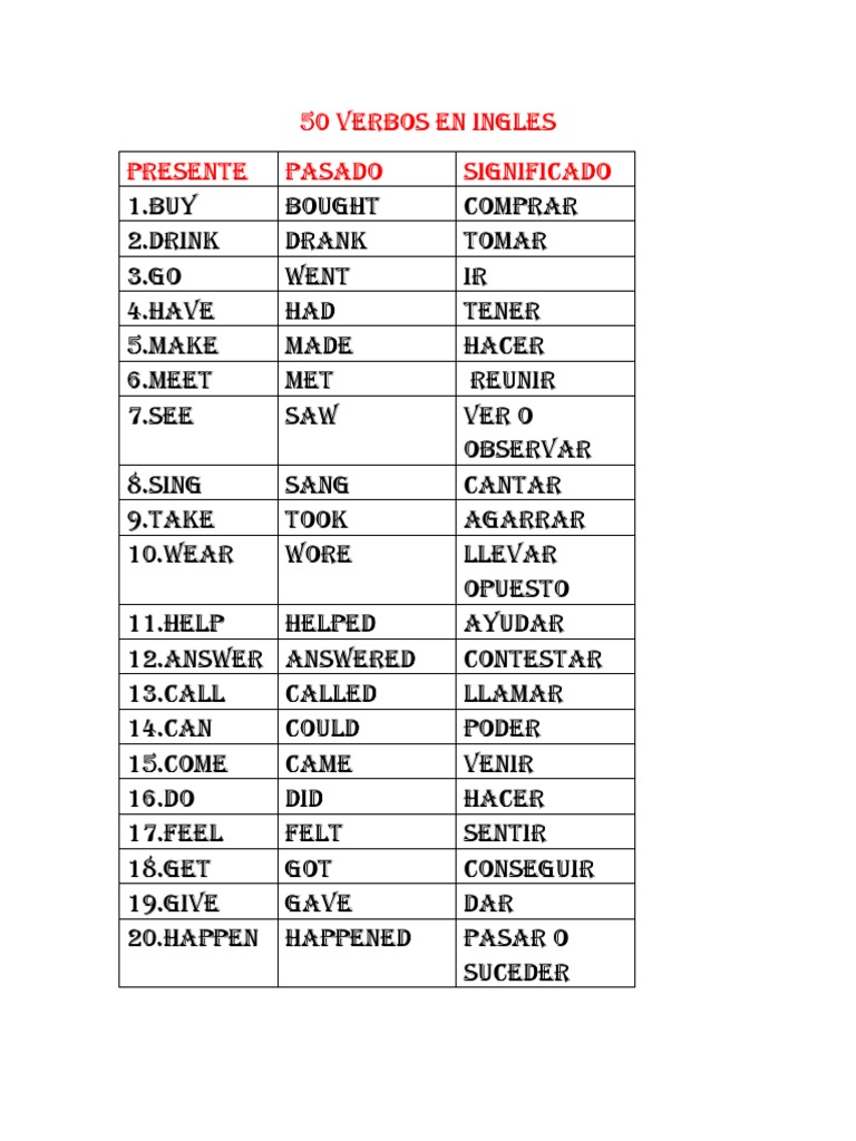 50 Verbos en Ingles PDF Verbos En Ingles O S Lista de los verbos regulares e irregulares más utilizados en el idioma ingles, divididos en tipo, tiempo verbal y con su traducción. 101 rows entra para aprender los 100 verbos más usados en inglés. Con ellos ampliarás tu vocabulario y empezarás a hablar como un nativo. Ejemplos, audios y ejercicios incluidos. En este artículo verás una lista de los 100. Verbos En Ingles O S.