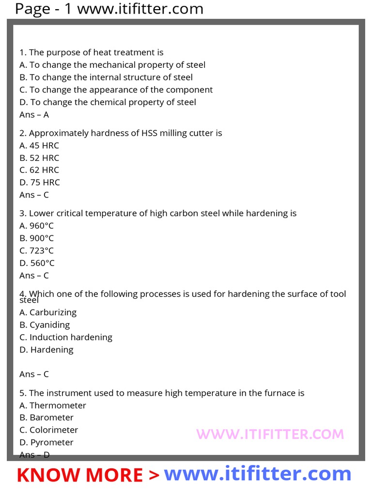 ItiFitterMultipleChoiceQuestionsHeatTreatmentChapterForItiJob, ItiFitterJob, Iti Heat Treatment Questions And Answers Heat treatment involves the use of heating or chilling, normally to extreme temperatures, to achieve a desired result such as hardening or softening of a material. What are the purposes of the processing heat treatments? Get heat treatment multiple choice questions (mcq quiz) with answers and detailed solutions. The section covers questions and answers on heat treatment principles of steels,. Heat Treatment Questions And Answers.