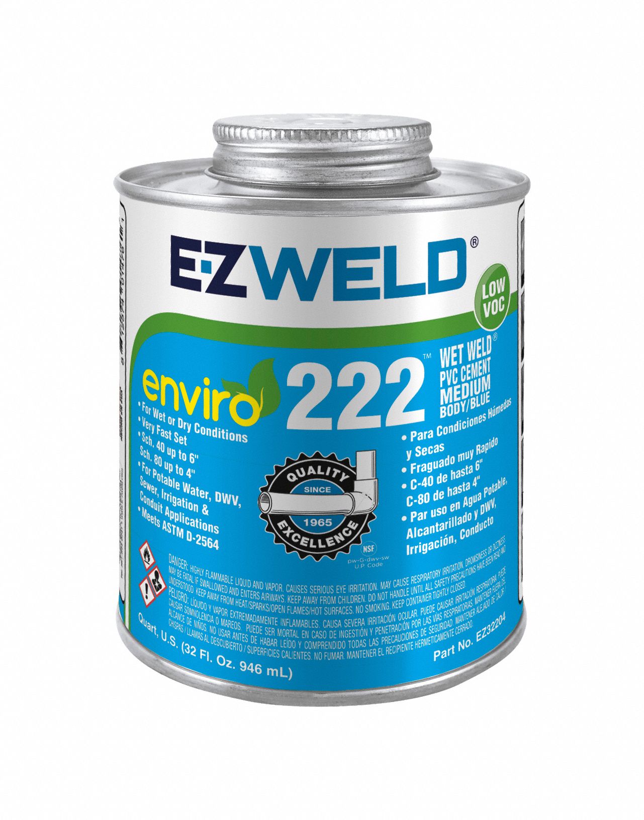 EZ WELD Blue PVC Cement, Medium Bodied, PVC, Size 32 oz, For Use With