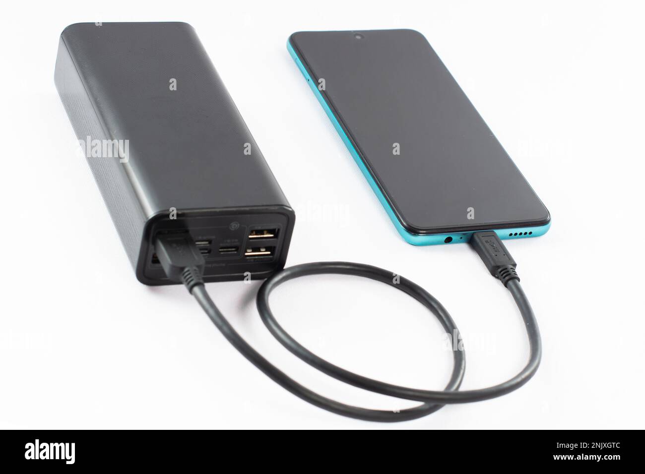 power bank with charging cable and phone, copy space and white