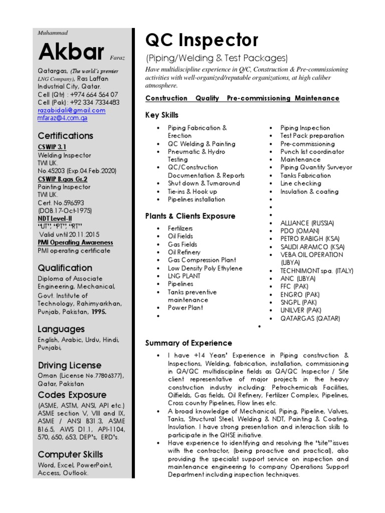 Qc Inspector Resume Nondestructive Testing Welding