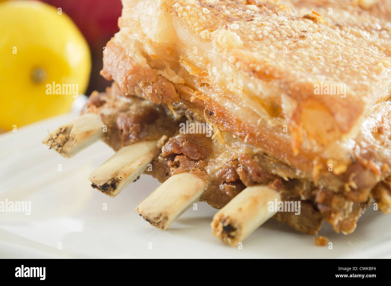 Big piece of deepfried pork belly on white serving plate Stock Photo
