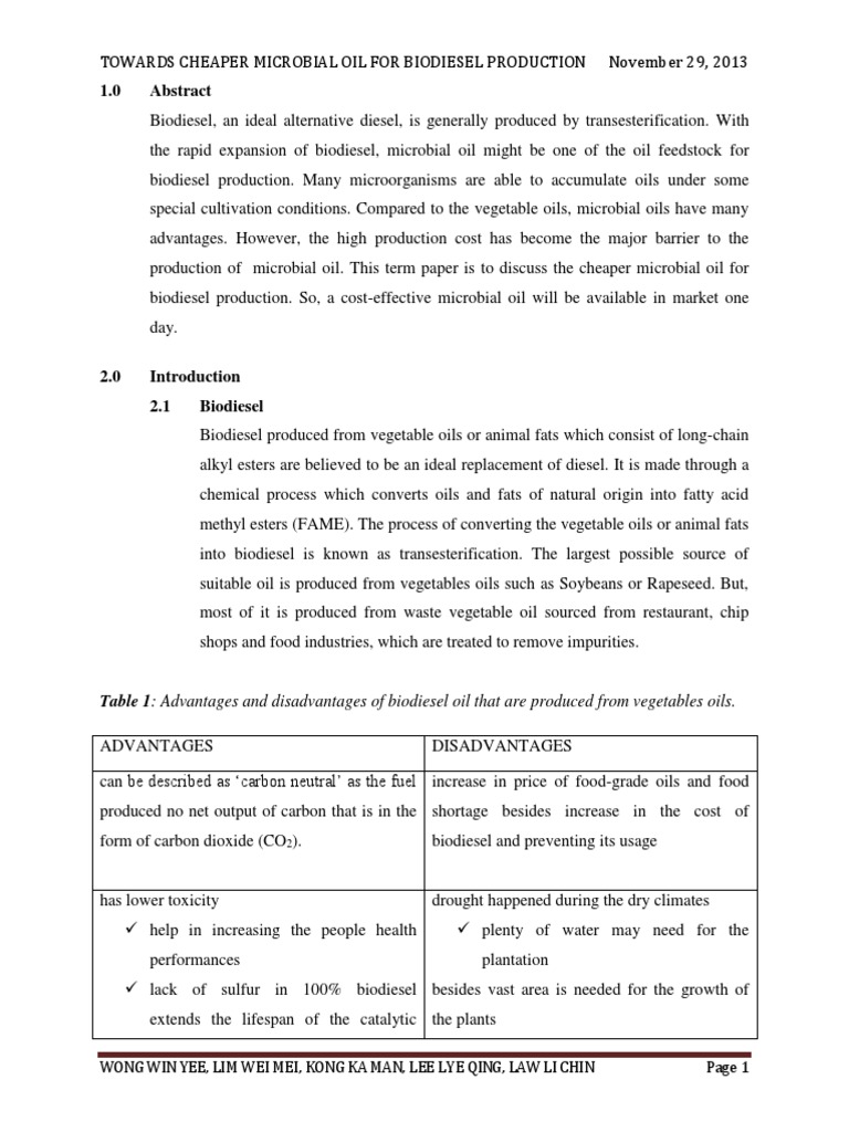 Table 1 Advantages and Disadvantages of Biodiesel Oil That Are