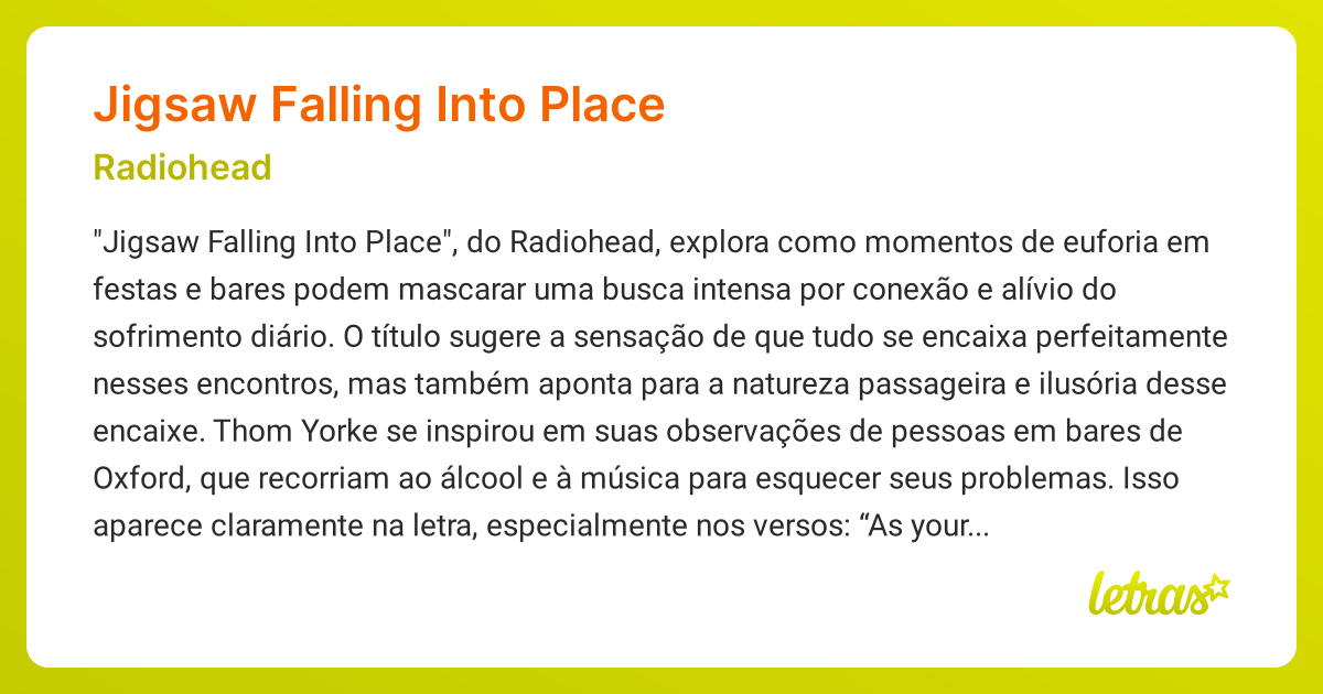 La historia y el significado de la canción 'Jigsaw Falling Into Place Jigsaws Falling Into Place Play along with original audio. Jigsaw falling into place, a song by radiohead, holds a special place in the hearts of many fans. Released in 2007 as part of their. Jigsaw falling into place lyrics by radiohead. Just as you take my hand just as you write my number down just as the drinks arrive just as. //// radiohead jigsaw. Jigsaws Falling Into Place.