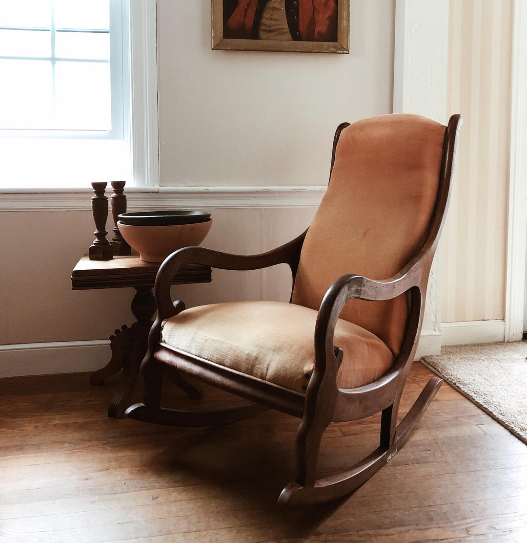 Early 1900s Upholstered Wood Rocker, wood rocking chair, pink