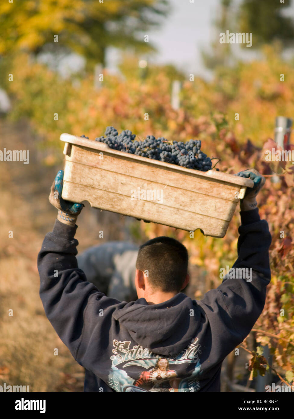 Farmworkers carrying grapes in Paso Robles California Stock Photo Alamy