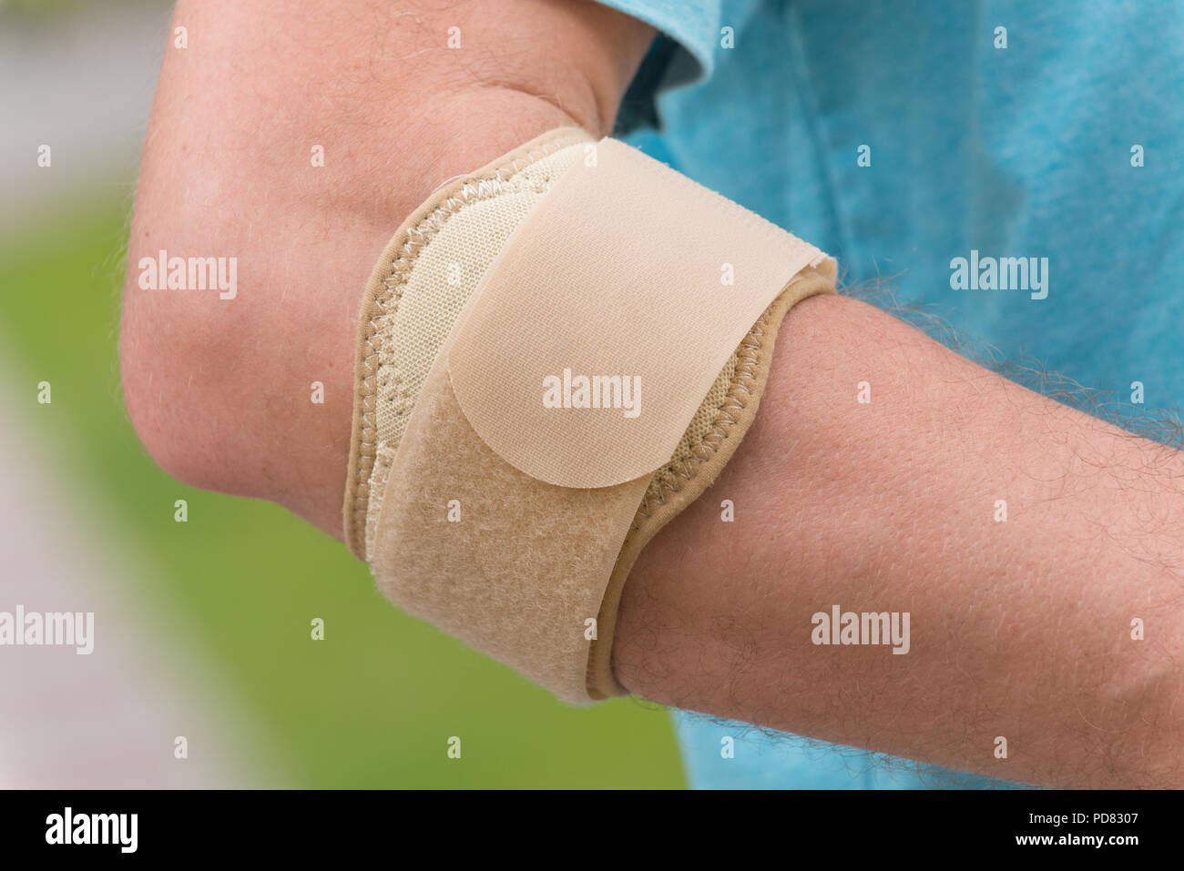 Man wearing elbow brace to reduce pain Stock Photo Alamy