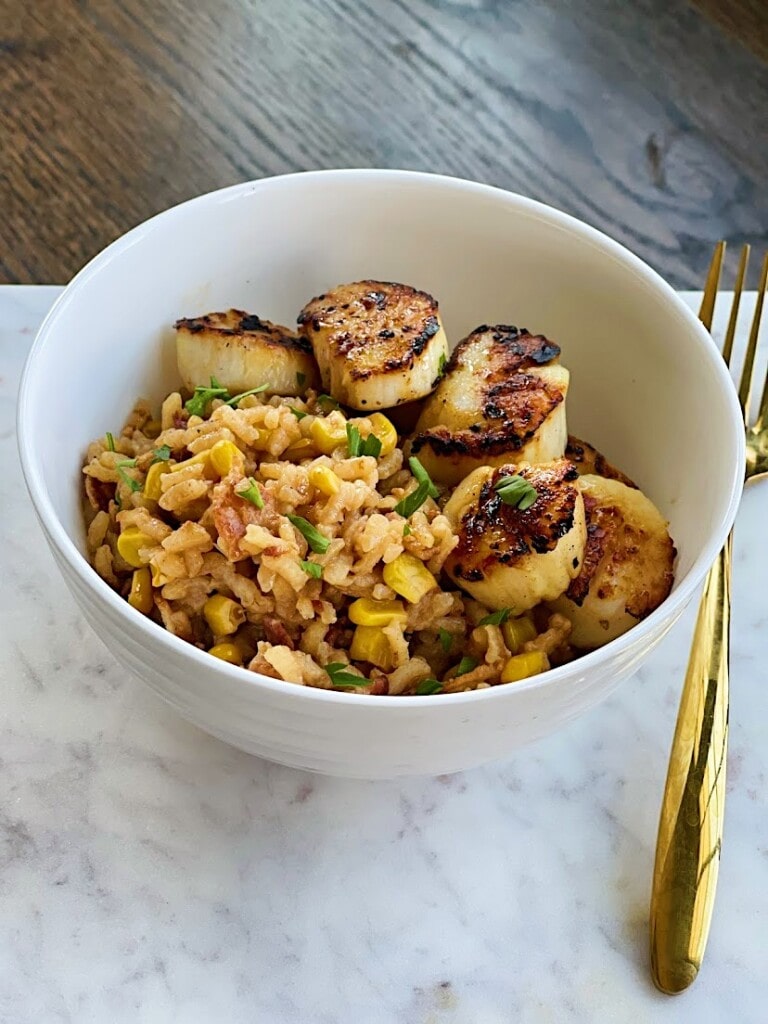 Scallops Over Bacon and Corn Risotto Sweet Savory and Steph