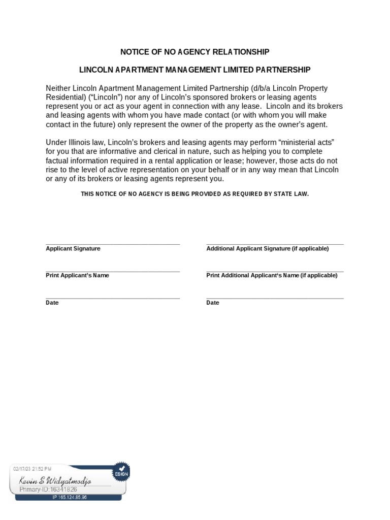 Notice of No Agency Relationship Lincoln Apartment Management Limited