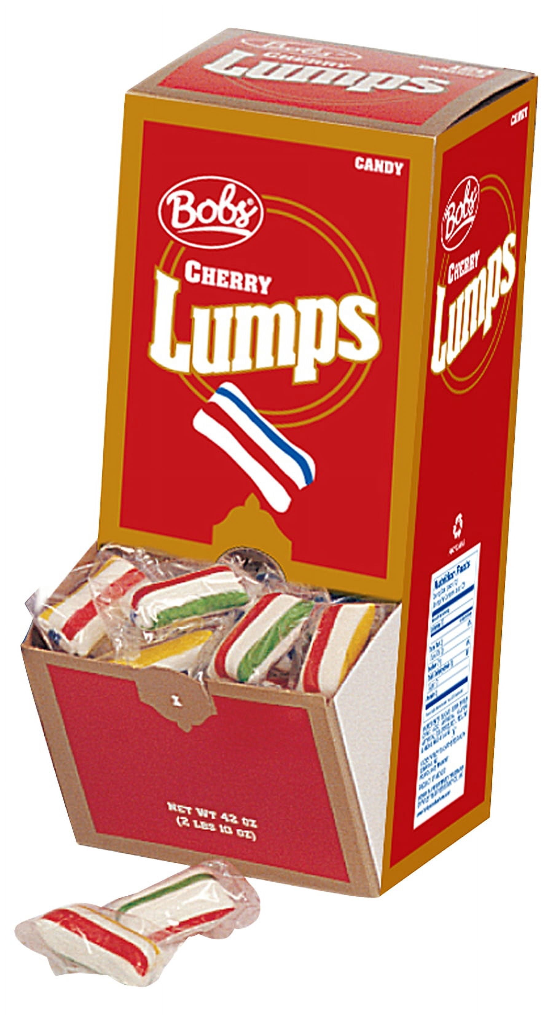BOB'S CHERRY LUMPS 48CT Gazaly Trading Cherry Candy Lumps Red, yellow, green, blue, and white, these striped lumps remind us of a circus tent! Free shipping (fedex ground) on orders over. Each display box contains 120 pieces. This individually wrapped candy is made to travel. Sold in a display box. Candyman's individually wrapped hard candy cherry lumps, 16 ounce bag. Red, yellow, green, blue, and white, these striped lumps. Cherry Candy Lumps.