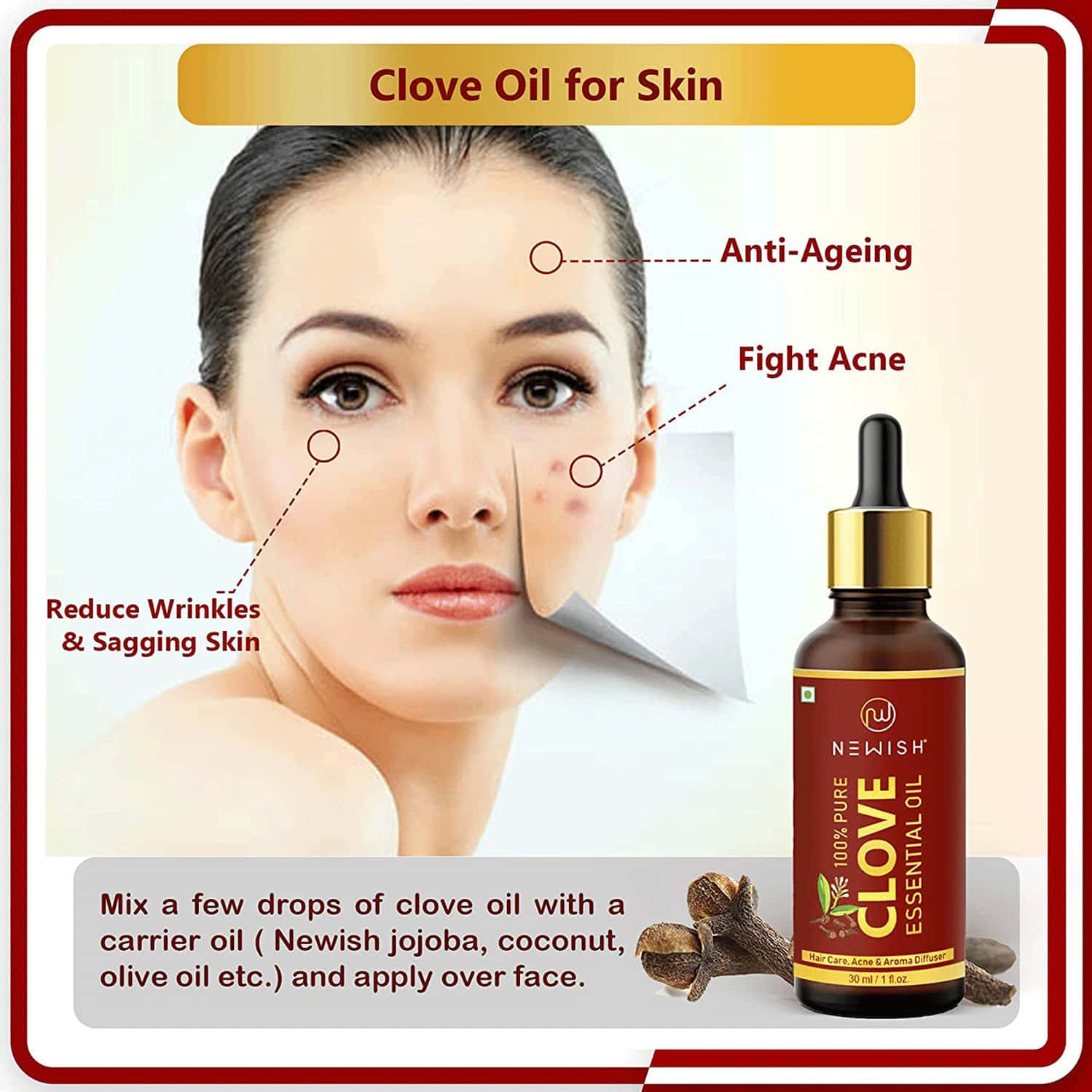 Newish® Pure & Natural Clove Oil for Teeth Pain, Skin & Hair 30ml Clove Oil For Skin And Hair Similar to other spices, cloves can be used as an essential oil. You can add clove in your diet or prepare a hair mask using it. Using clove on the skin can heal and fade acne scars, fights the sign of aging, fade dark spots and blemishes from the skin. Clove works greatly for the conditioning of the hair. According. Clove Oil For Skin And Hair.