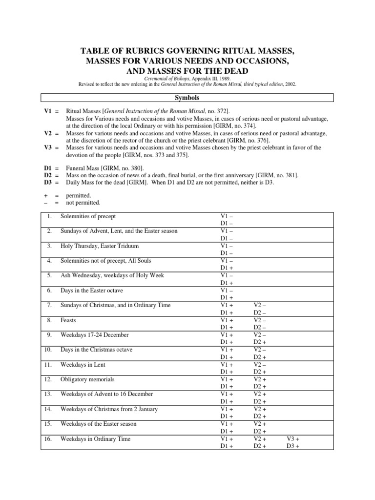 Table of Rubrics For Masses PDF Christian Denominational Families