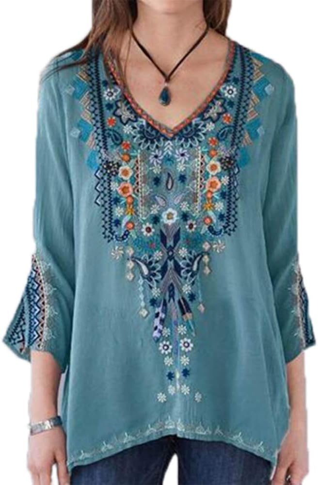 Women's Casual V Neck Embroidered Blouse Tops 3/4 Sleeve Loose Shirt