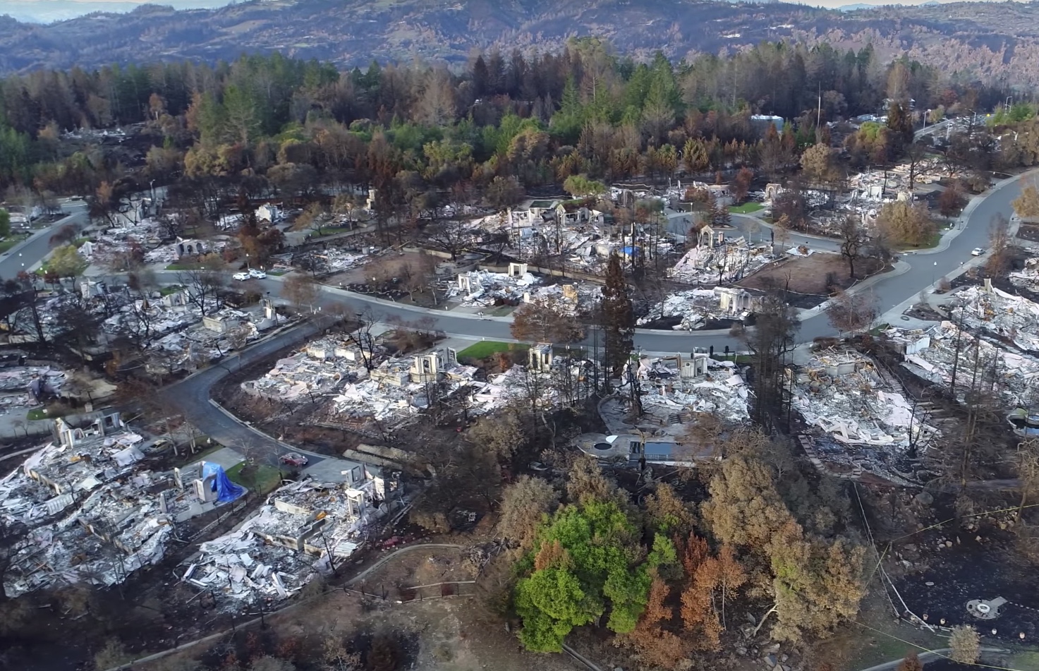 Explained Unburned trees next to burned down structures as evidence of