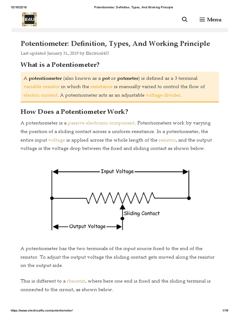 Potentiometer Definition, Types, and Working Principle PDF Potentiometer Brief Definition The potentiometer is an electronic component used for measuring. summary: this article deals with knowledge of the potentiometer’s basic theory, working principle, types, sizing,. In most applications, it may also be used as a variable resistor. what is a potentiometer? It’s also used to compare the emfs of various cells. If only two terminals are used,. Potentiometers are. Potentiometer Brief Definition.