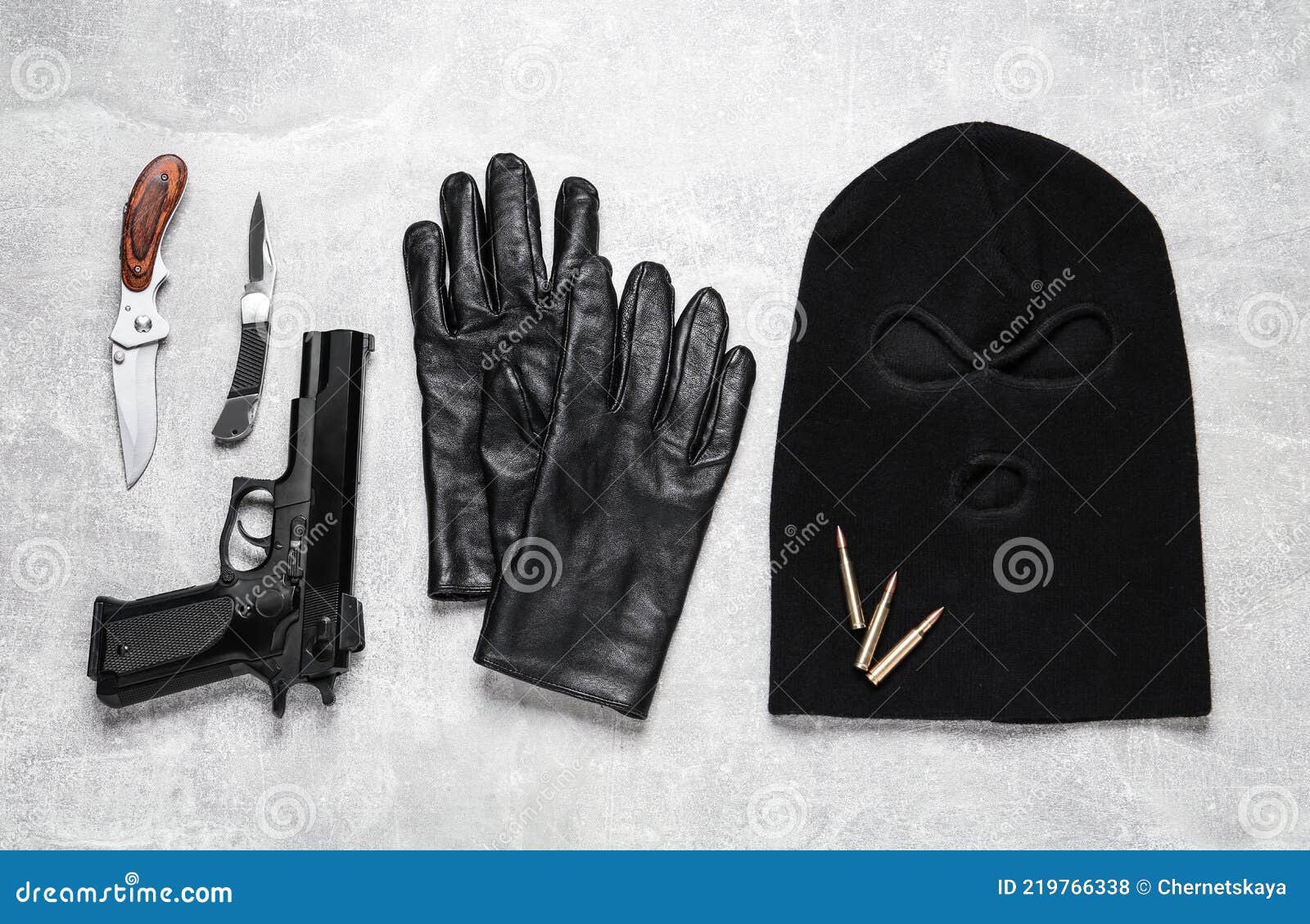 Flat Lay Composition with Balaclava and Weapons on Light Table Stock