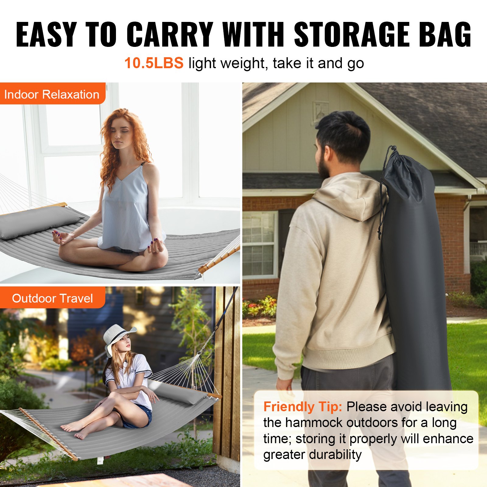 VEVOR Double Quilted Fabric Hammock, 12 FT Double Hammock with Hardwood