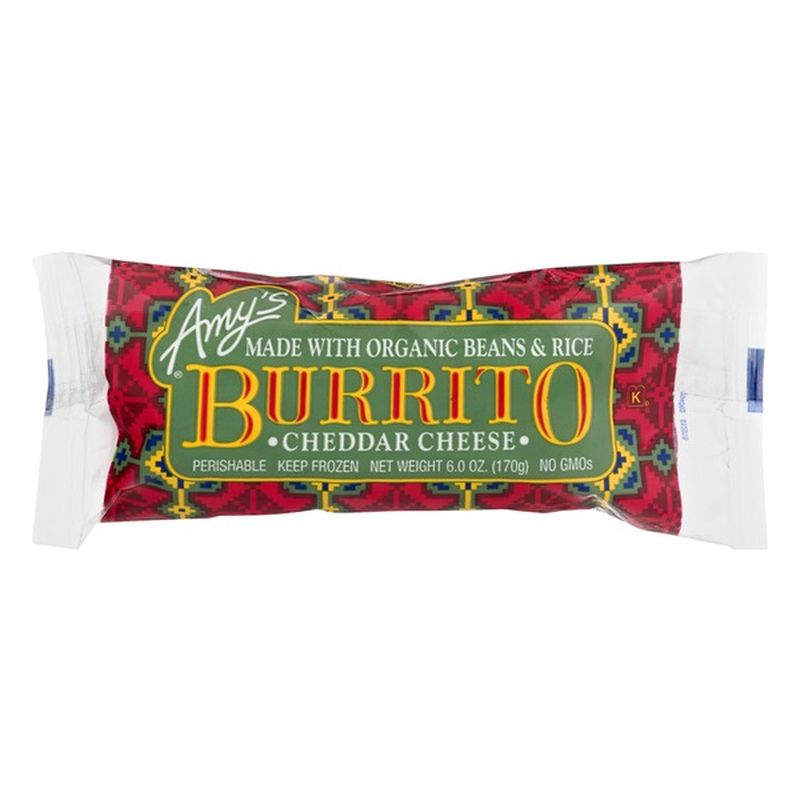Amy's Cheddar Cheese, Bean And Rice Burrito, 6 Oz Pouch, 4/pack Amy's Cheddar Cheese Bean And Rice Burrito cheddar cheese burrito with beans & rice. cheddar cheese, bean & rice burrito. bean & cheese burrito / fromage cheddar burrito. Packed with flavor and perfect for a quick meal, you'll be rolling up these bad boys in no time. The burritos are made from scratch with an organic tortilla, organic pinto beans, brown rice and cheddar. Amy's Cheddar Cheese Bean And Rice Burrito.