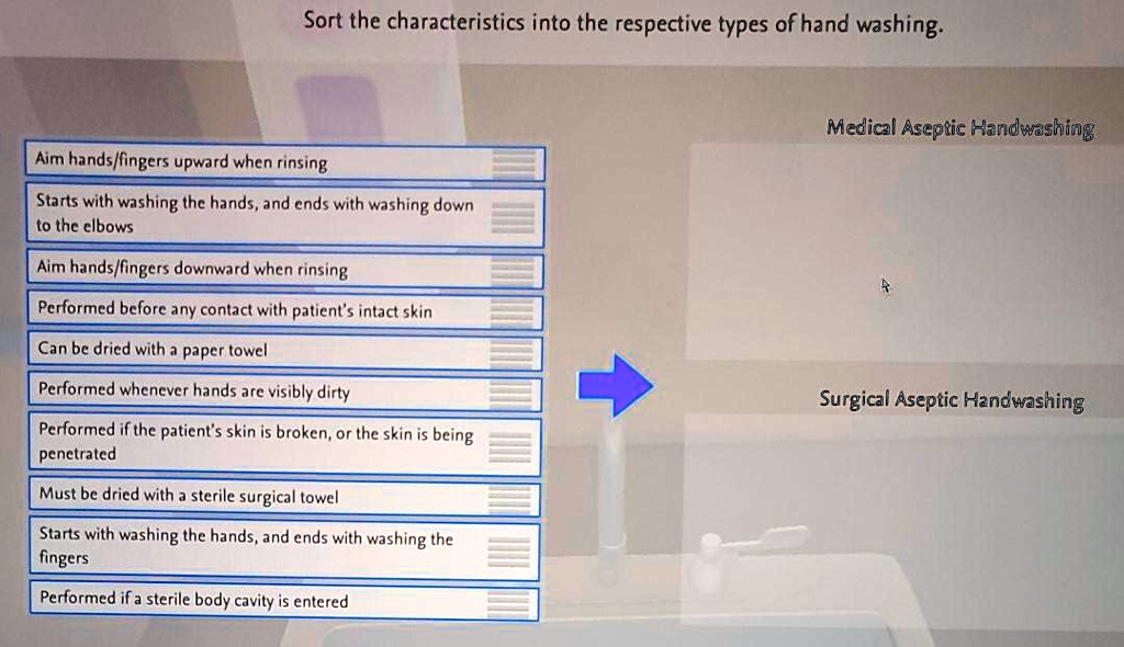 SOLVED Sort the characteristics into the respective types of hand Medical Vs Surgical Aseptic Hand Washing — hand hygiene protects both healthcare personnel and patients. — according to the cdc, hand hygiene encompasses the cleansing of your hands with soap and water, antiseptic hand. The differences between medical and surgical asepsis. Hand hygiene means cleaning your hands with: — hand hygiene is one of the most important elements of infection control. The aim. Medical Vs Surgical Aseptic Hand Washing.
