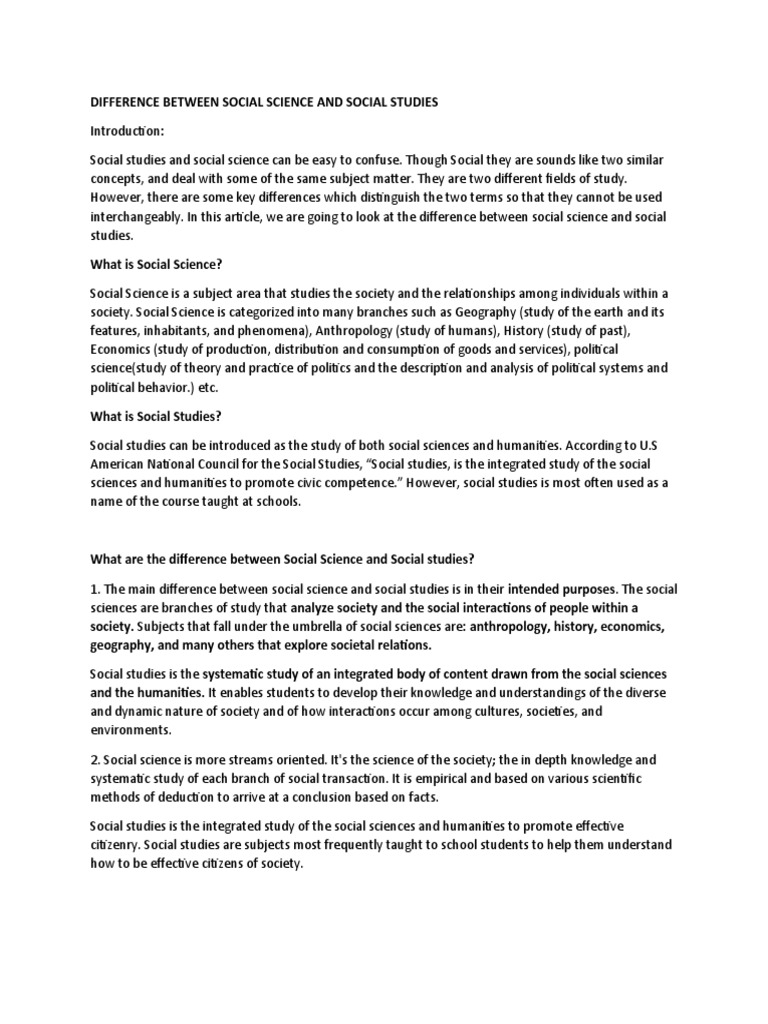 Difference Between Social Science and Social Studies 1 PDF Social Social Science Vs Social Sciences unlike social science, social studies is not limited to the scientific method and empirical research. a social science is any branch of academic study or science that deals with human behaviour in its social and cultural aspects. — what is the difference between social science and social studies? Here’s what you need to know in this regard.. Social Science Vs Social Sciences.