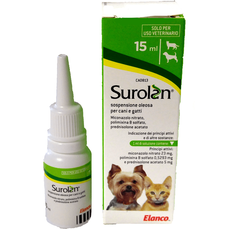 ELANCO SUROLAN GOCCE PER IL TRATTAMENTO DELLE OTITI ESTERNE E INFEZIONI Surolan Ear Drops For Cats & Dogs Surolan ear drops and cutaneous suspension is for the treatment of otitis externa and skin infections in cats and dogs. (polymixin b, miconazole and prednisolone). Surolan is an otic suspension specifically designed for treating ear infections in both cats and dogs. Surolan is indicated for the treatment of canine otitis externa associated with susceptible strains of yeast. If your dog. Surolan Ear Drops For Cats & Dogs.