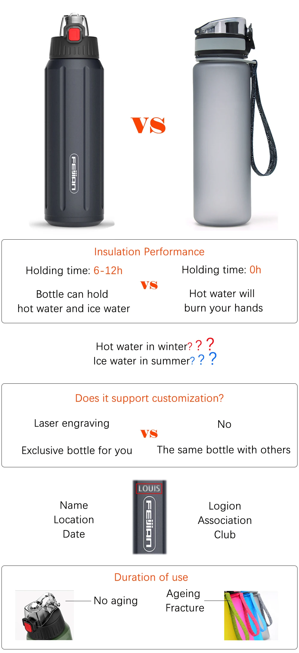 Feijian Thermos Shaker Bottle Portable Sport Water Bottle Double Wall