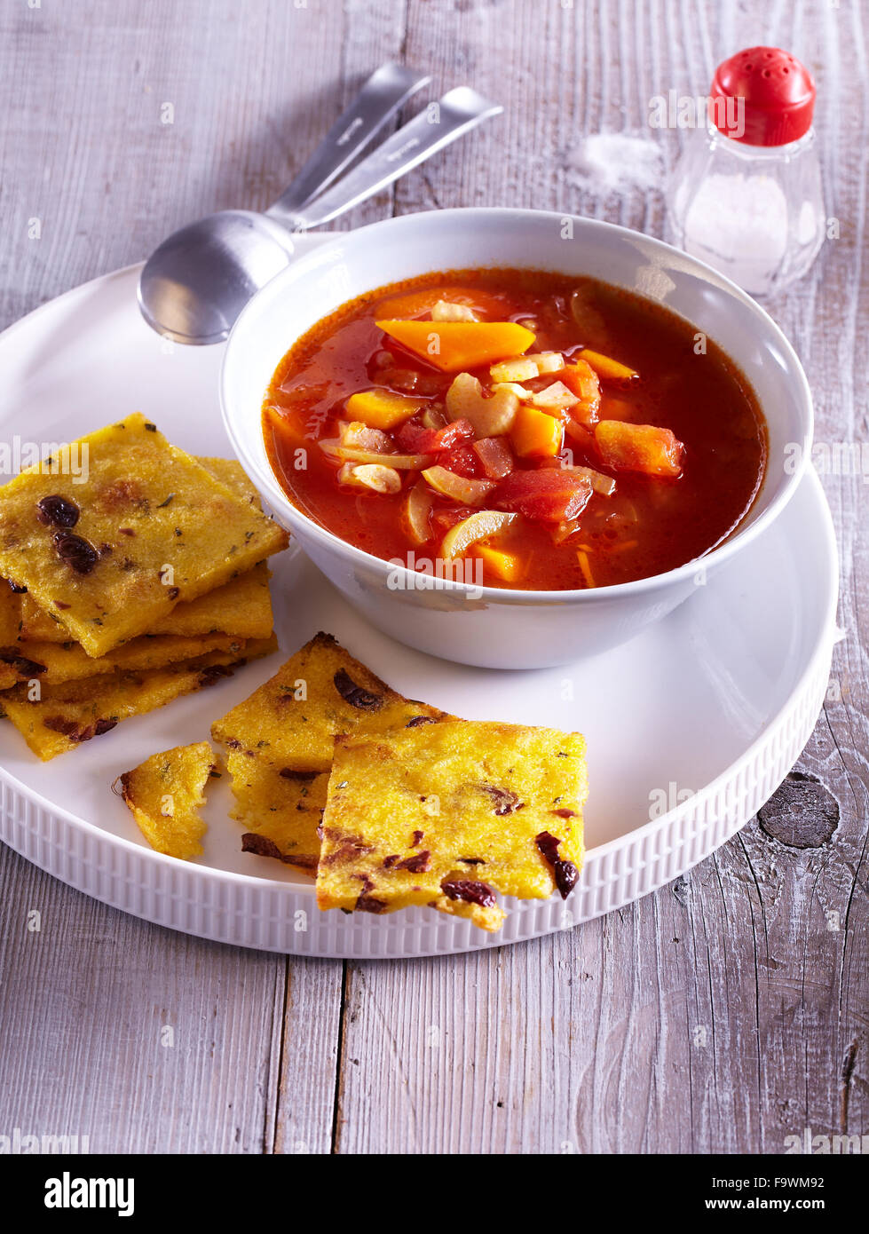 Vegetable broth with polenta crackers Stock Photo Alamy