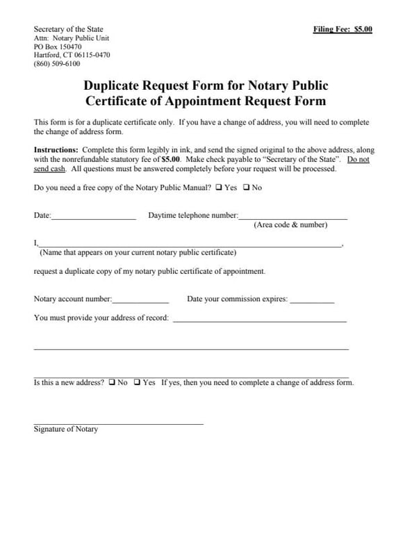New Haven, Connecticut Duplicate Request Form for Notary Public